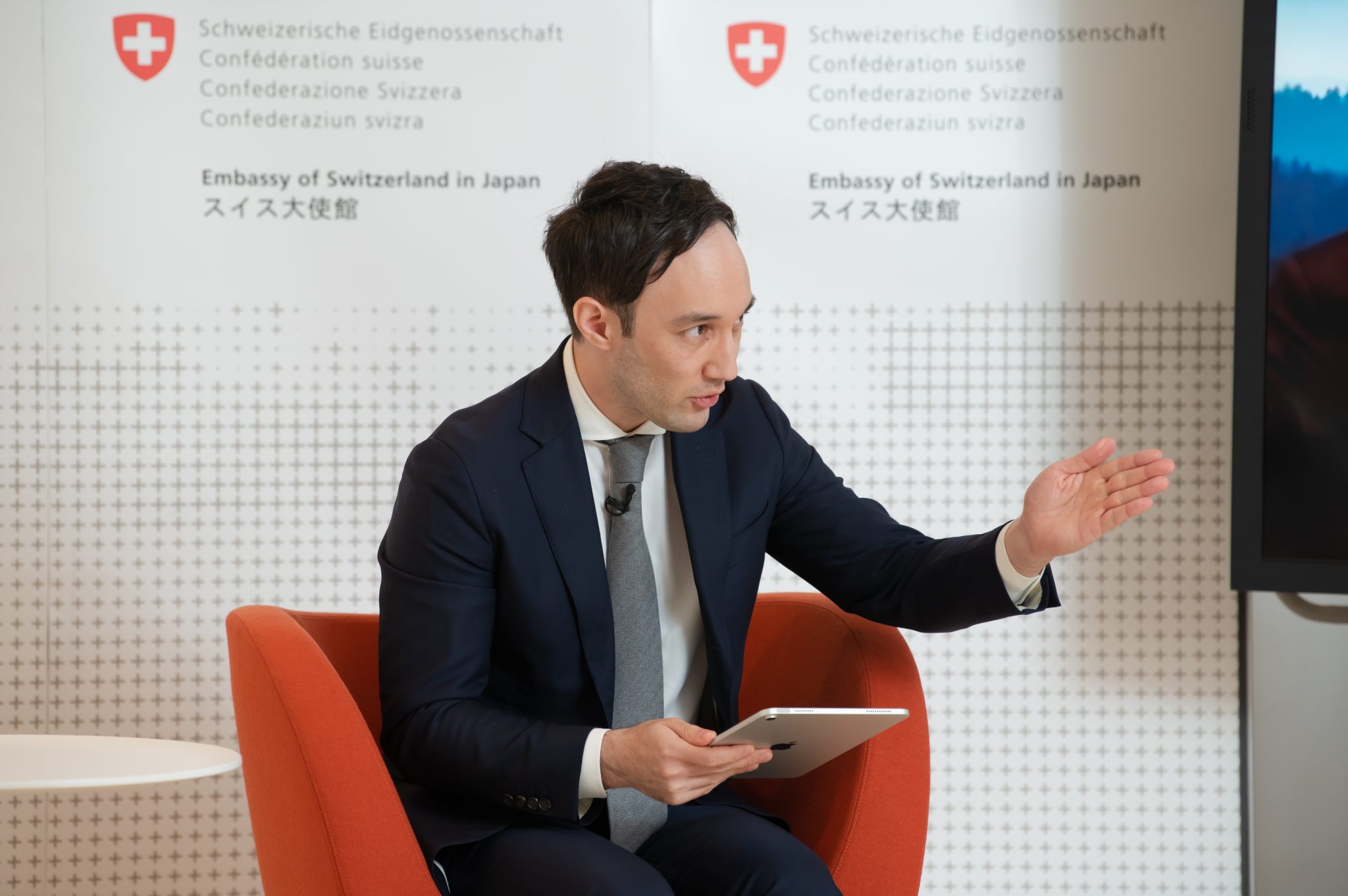 A first panel of government and academia representatives focused on shaping effective framework conditions for sustainable finance. It was moderated by Jonas Pulver, Head of the Communications and Culture Section at the Embassy of Switzerland in Japan.