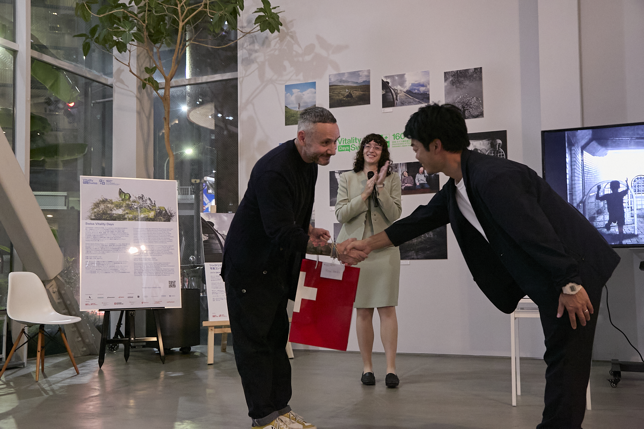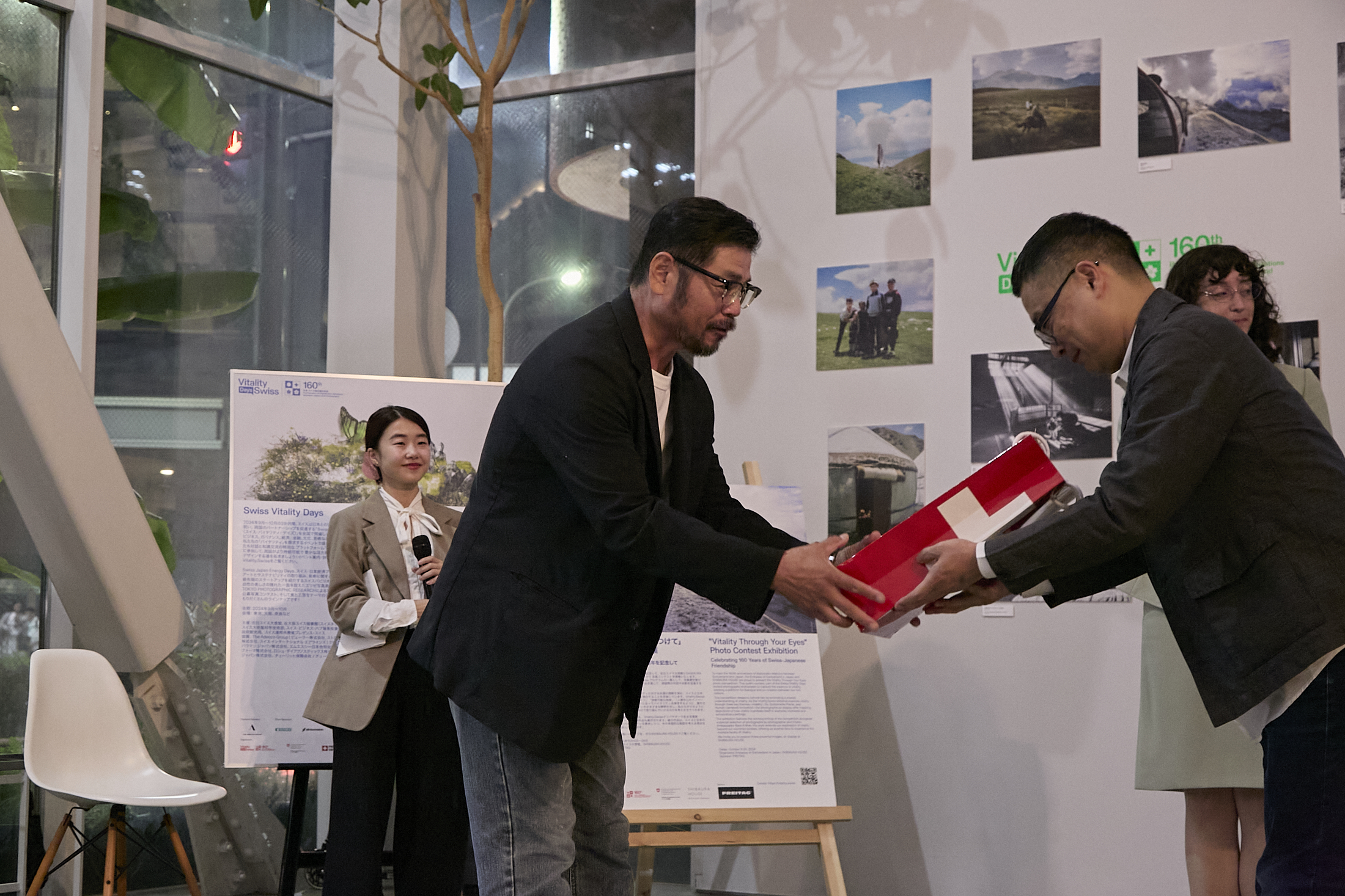 The highlight of the exhibition was the award ceremony held on October 11, which brought together the winners, their families, friends, and photography enthusiasts. Ambassador-Designate Roger Dubach, alongside jury members Masaru Ito (SHIBAURA HOUSE), Ingrid Dubach-Lemainque, Sawako Fukai (TOKYO PHOTOGRAPHIC RESEARCH), and Basil Kräher, honored the participants for their creative contributions. Although jury member Taisuke Koyama could not attend, his influence was felt through the selected works. The winners in attendance, Syozo Hamano (Ito Prize) and René Hauser (Public Vote Prize), were presented with gifts, including a contribution from FREITAG, a nod to the contest’s emphasis on sustainability.