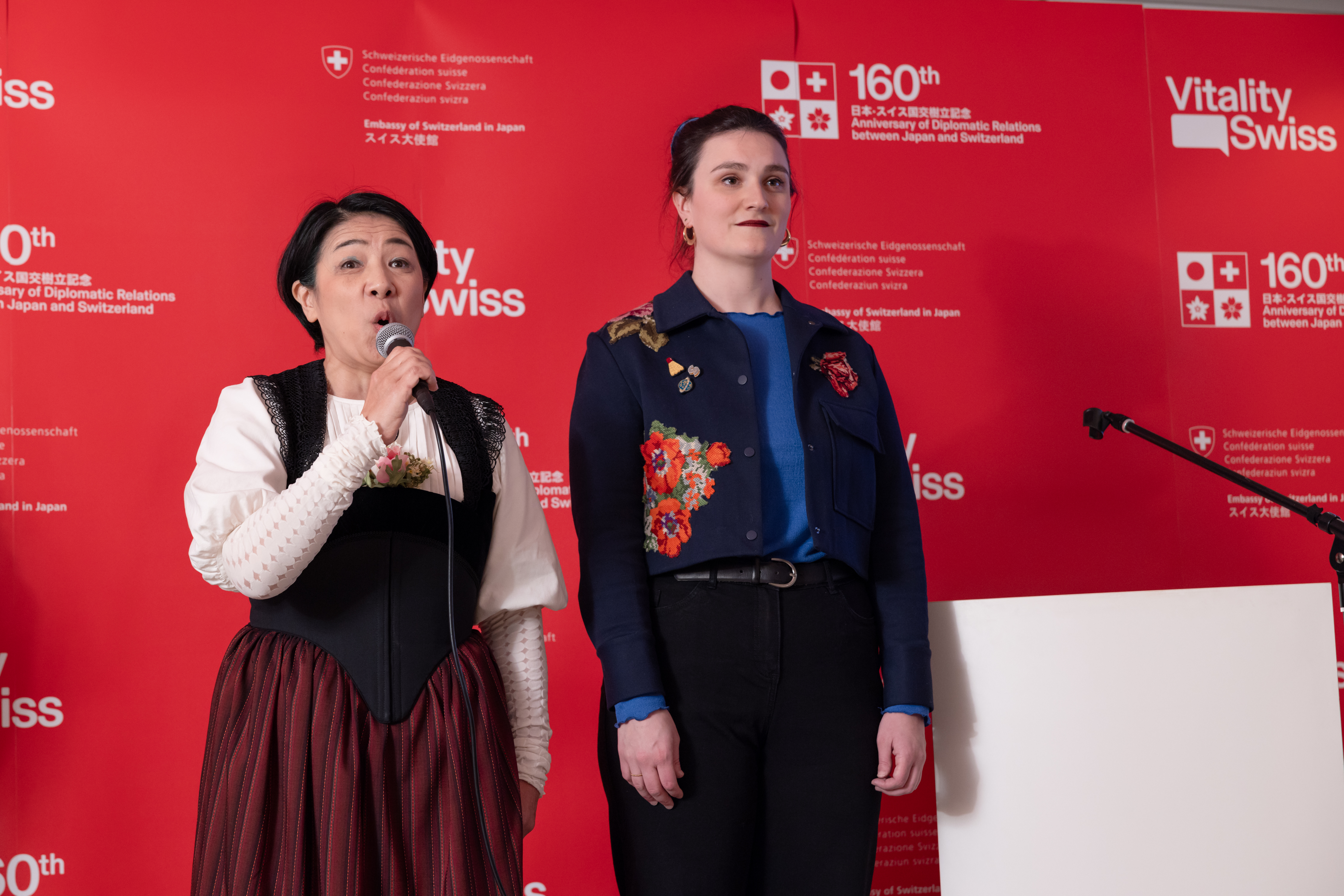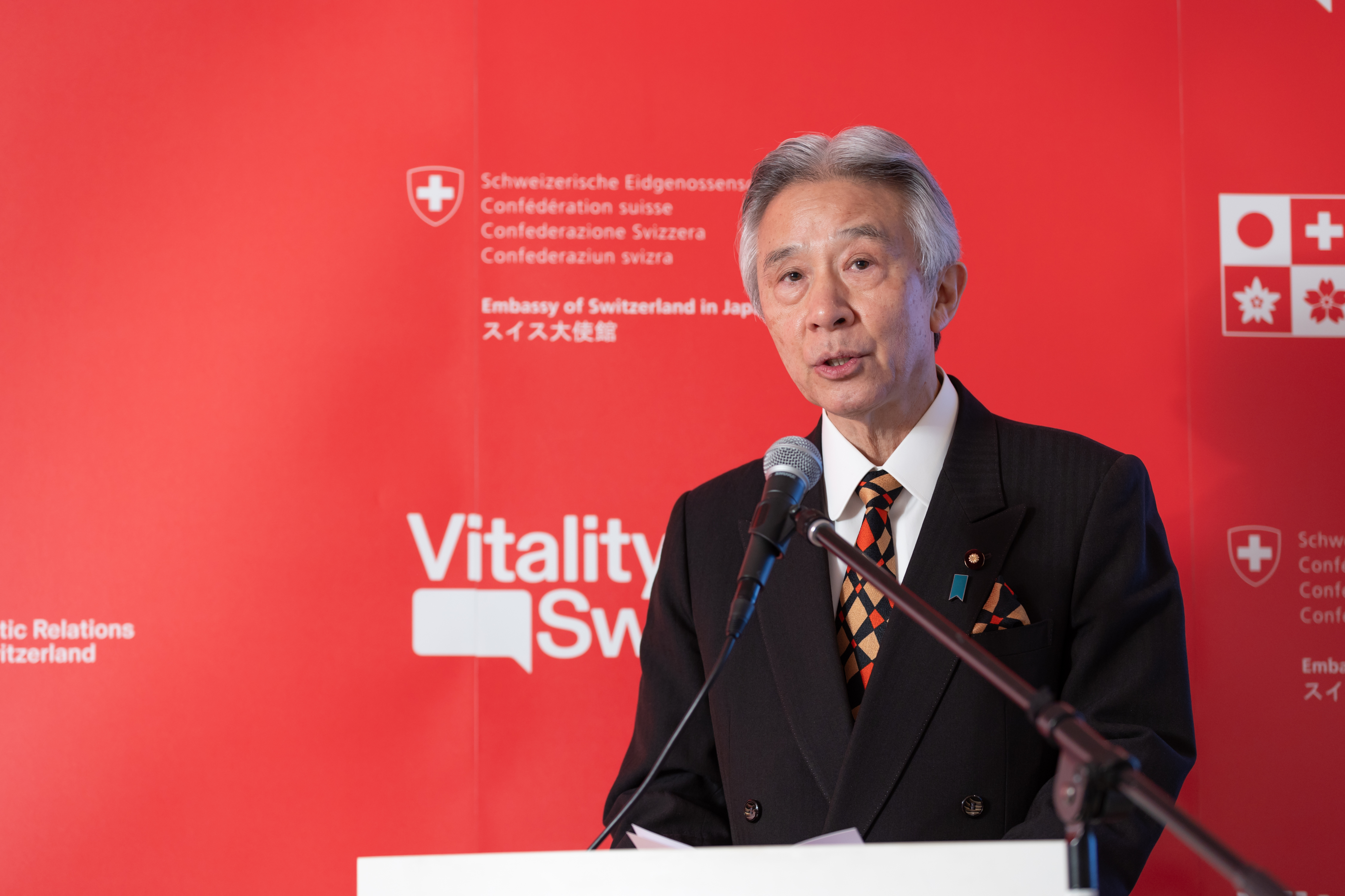 スイス人ヨーデル歌手シモーネ・フェルベルと日本人ヨーデル歌手伊藤啓子による心揺さぶられる国歌演奏で宴の幕が開きました。アンドレアス・バオム駐日スイス大使と盛山正仁文部科学大臣による開会あいさつでは、両名とも、科学、技術、イノベーションにおけるスイスと日本の協力の可能性が大きいことを強調しました。日本スイス友好議員連盟会長でありバイタリティ・アンバサダーを務める衛藤征士郎衆議院議員による心のこもった乾杯で式典が締めくくられました。