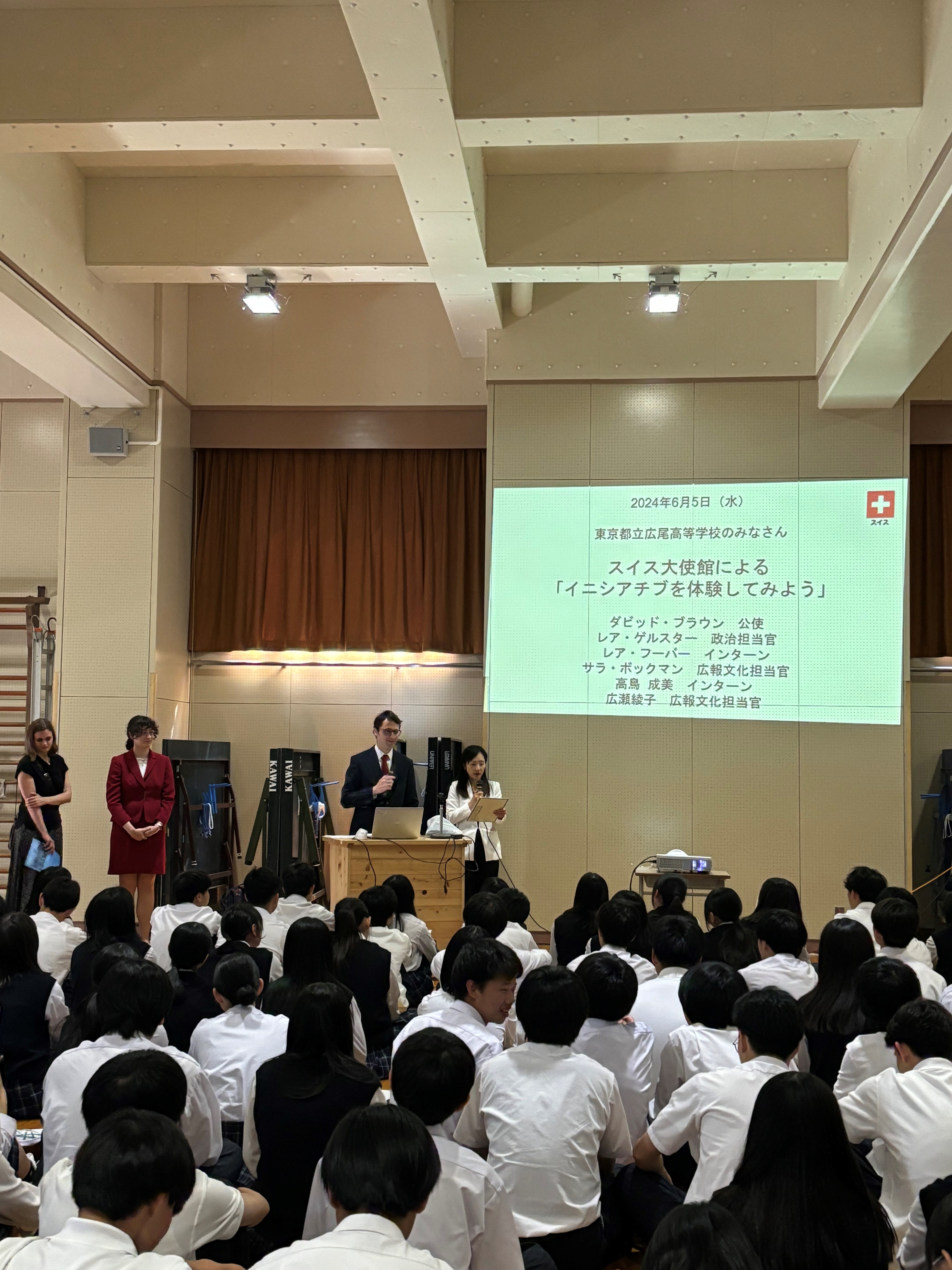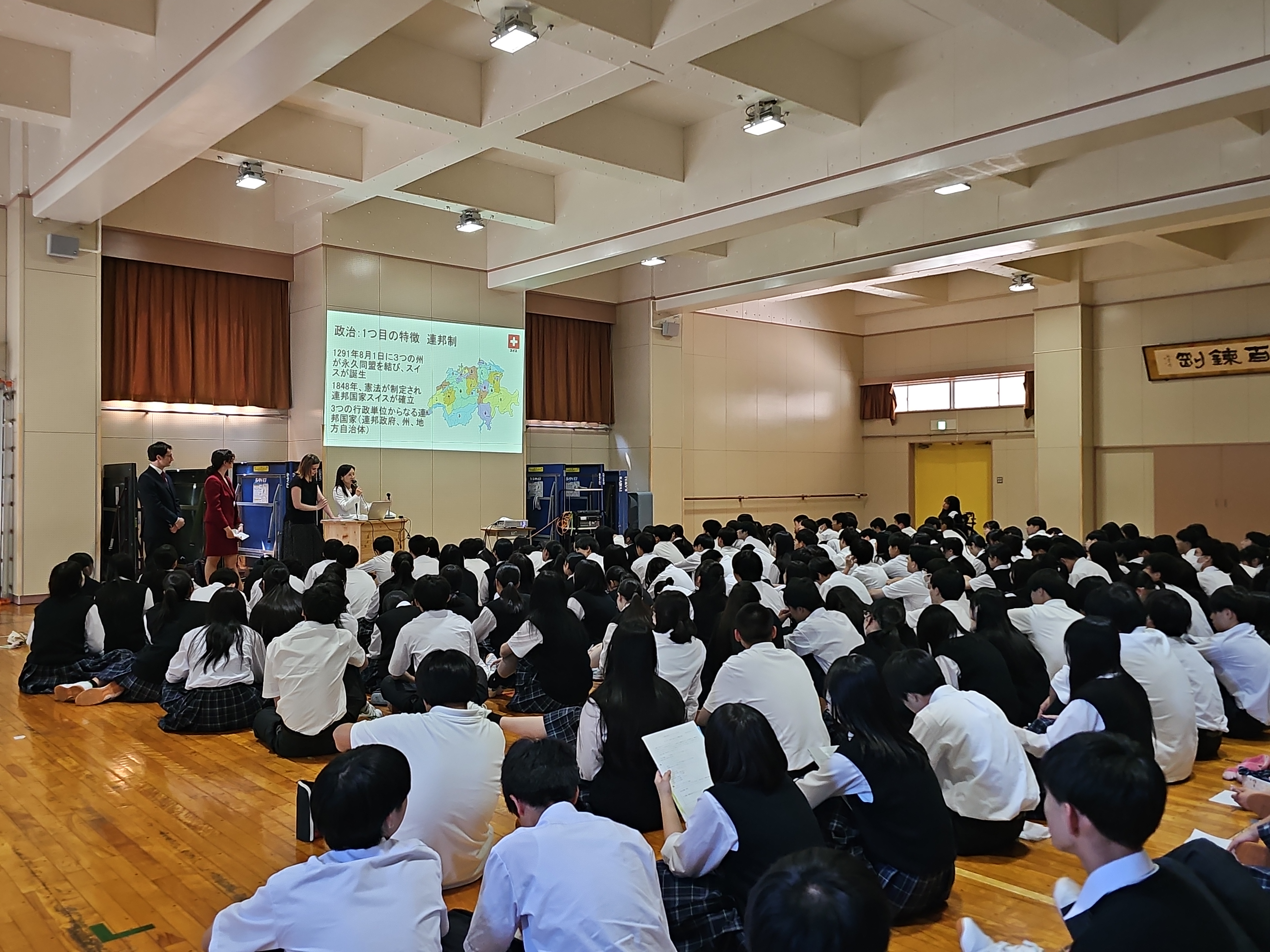 2024年6月、在日スイス大使館は、スイスの活力と多様性を示す直接民主制を、日本の学生に体験してもらう学校交流事業を、東京都立広尾高等学校の協力により実施しました。スイス大使館の職員が高校でスイスの文化や政治制度を紹介し、生徒はイニシアチブ(国民発議)を疑似体験する2回のプログラム。Vitality.Swissのプログラムのひとつとして行われるこの「イニシアチブを体験しよう」プロジェクトは、生徒自身がそのプロセスを体験することで、政治参加への理解を深めることを目的としています。