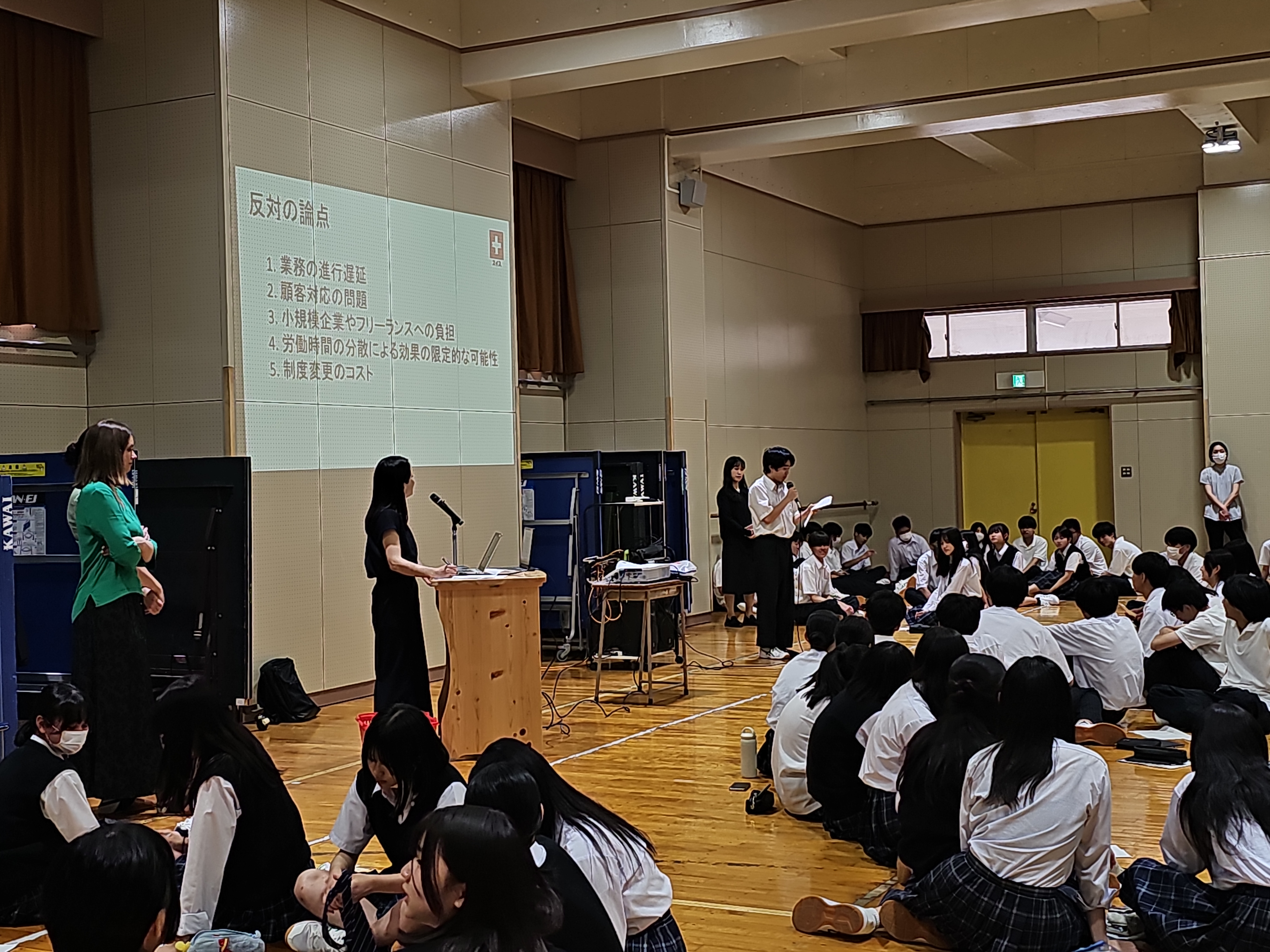 第2回目となる6月26日には「働き方改革を進めるため、水曜日を休日とする」というイニシアチブの賛否についてグループごとに議論が交わされました。各グループの代表者がグループの意見をその理由と共に全員に発表。その発表を元に総投票が行われ、最後は論評で締めくくられました。
