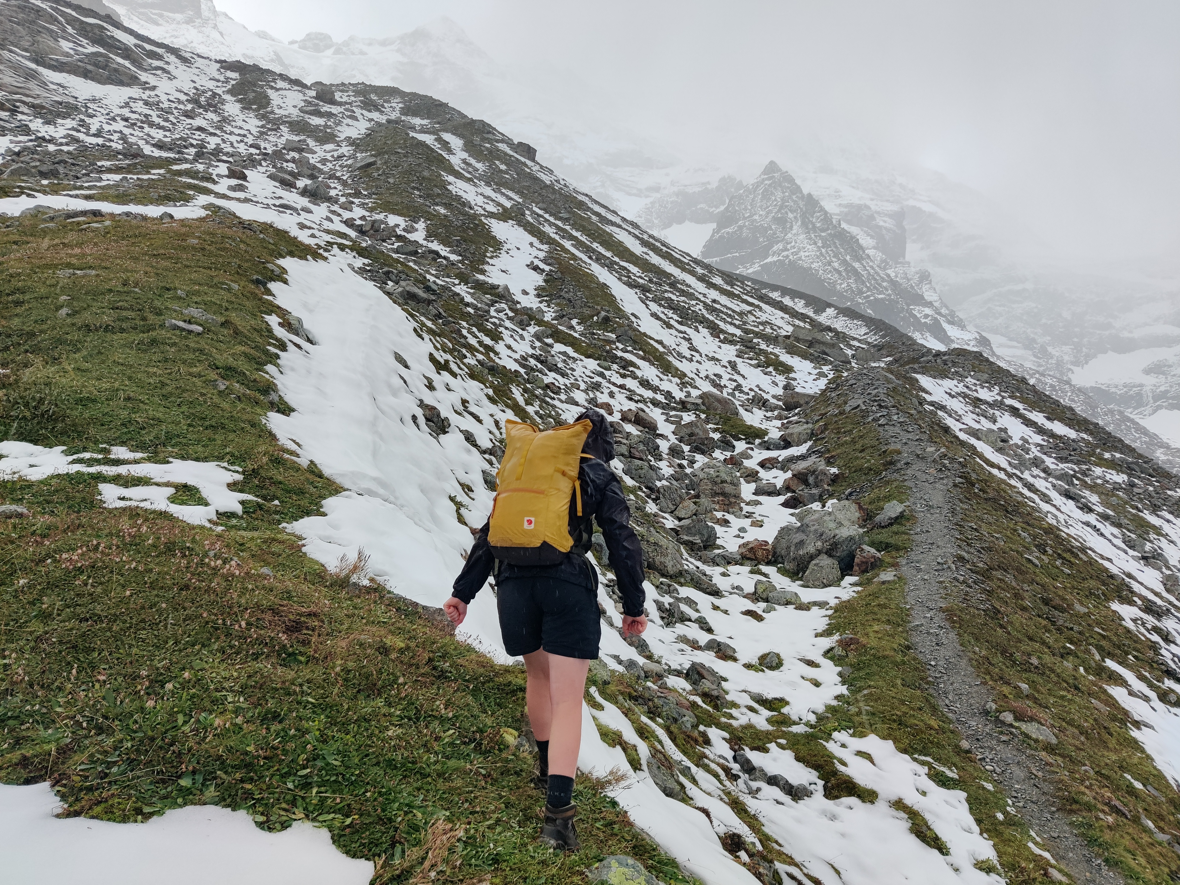 外国から訪ねてくれた友人にアルプスを見せたいと思っていたところ、9月のある日、ついにハイキングに出発することになりました。電車とバスを乗り継ぎ、無人の山小屋「シュマドリ・ヒュッテ」(Schmadrihütte)まで約4時間の道のりです。出発前には、スイス連邦地理局が提供する公式地図アプリ「swisstopo」で経路を確認しました。アプリには積雪状況もリアルタイムで表示されます。その日は小屋がちょうど雪線付近にあることが分かり、しっかり準備を整えて出発しました。